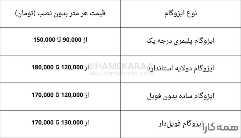 - ناحیه جغرافیایی (مثلاً قیمت ایزوگام کرج نسبت به شهرهای دیگر ممکن است متفاوت باشد)